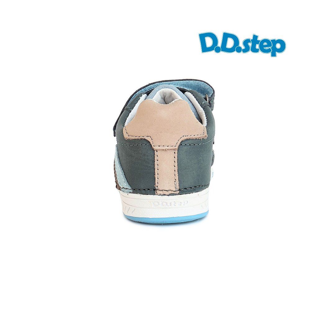 Topánky D.D.Step S040-335 v petroleum-modrej farbe s béžovými a svetlomodrými koženými detailmi sú stavané na každodenné nosenie. Prírodná koža dýcha, spevnená päta drží chodidlo v správnej polohe a svetlomodrá flexibilná podošva tlmí každý krok.