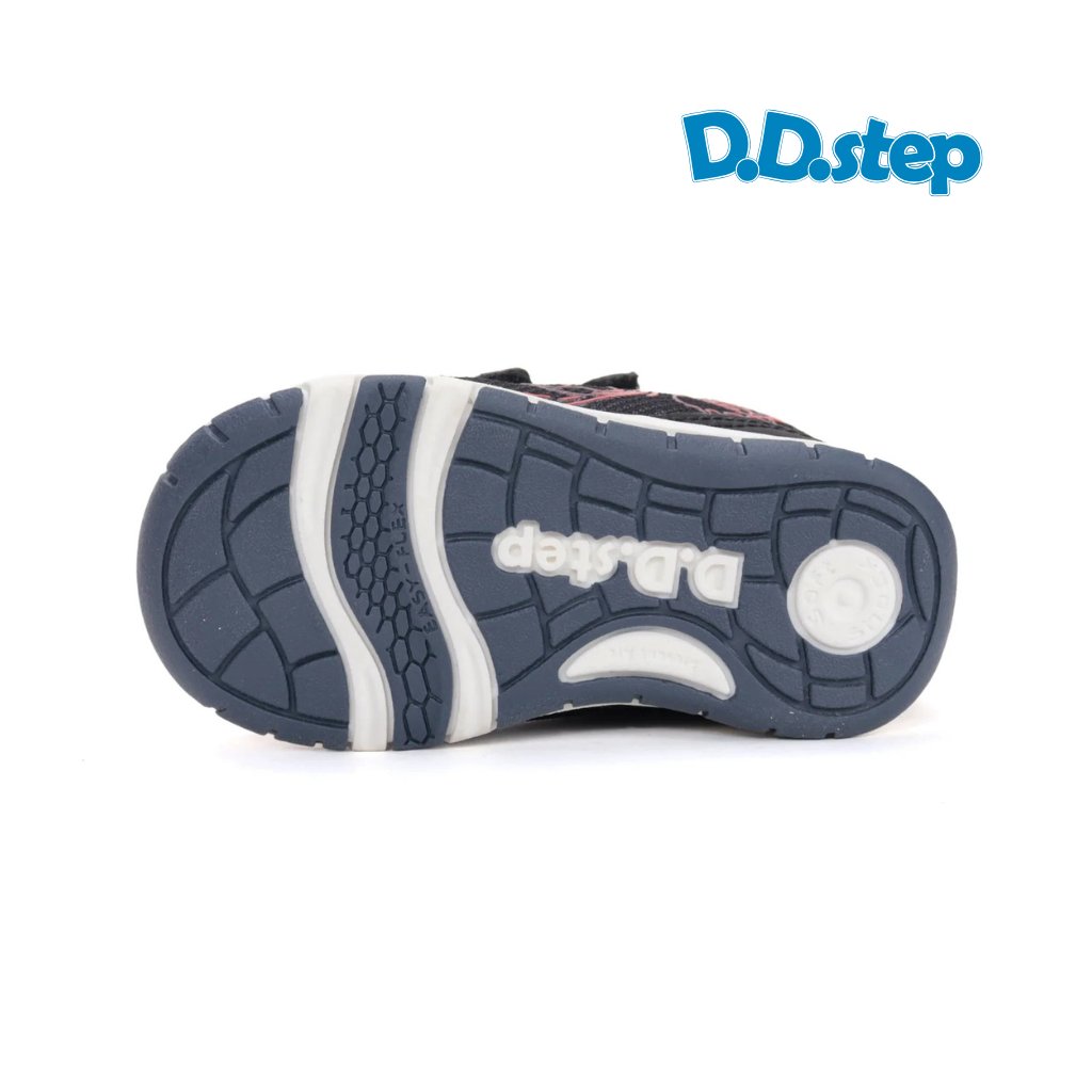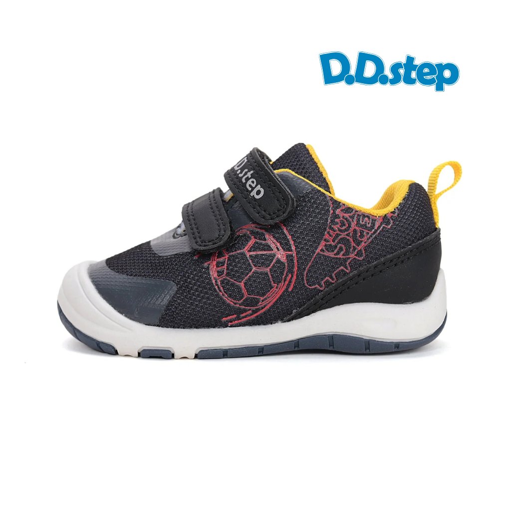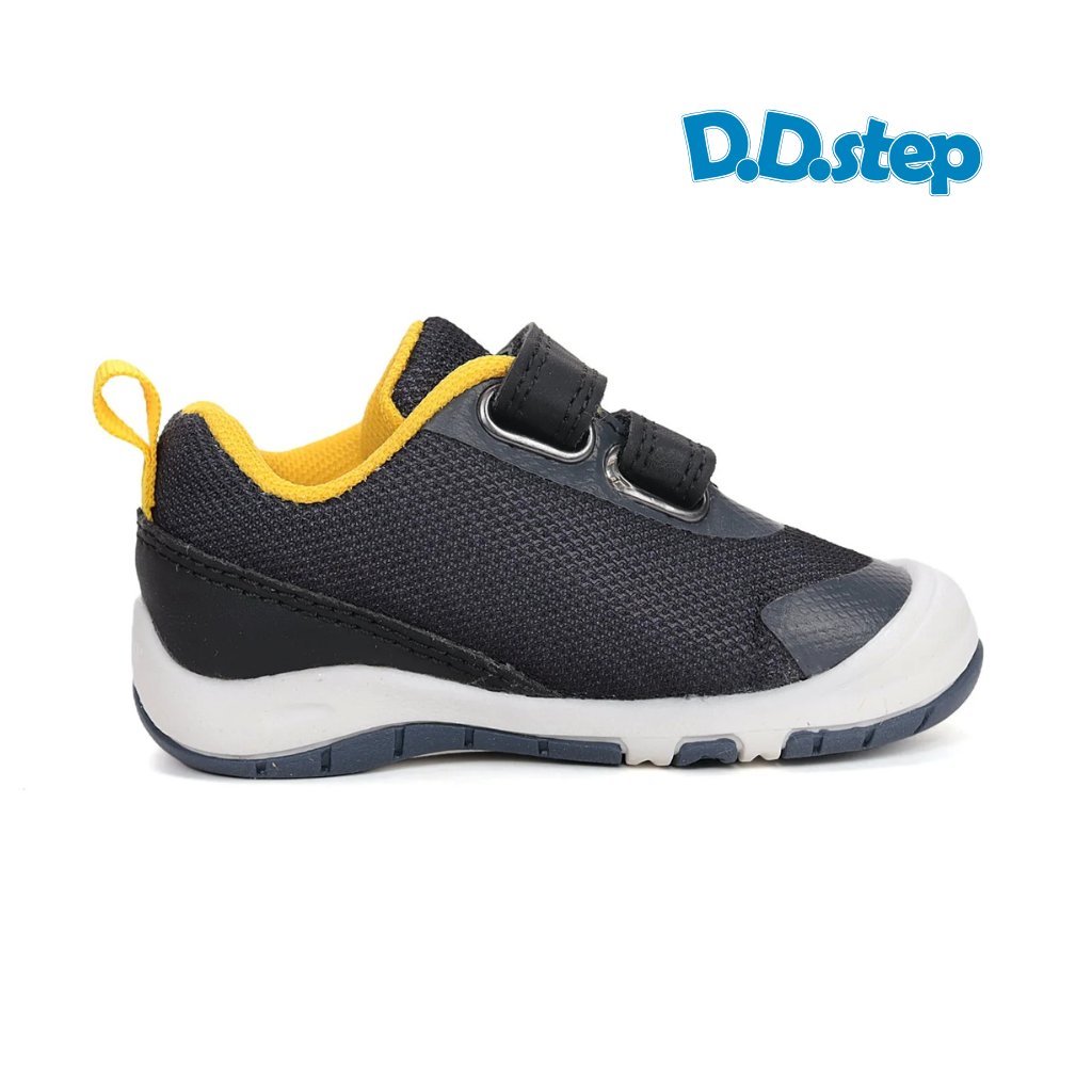Výrazným prvkom je žltý golier a žltá slučka na päte — kontrastná farba, ktorú si chlapci okamžite všimnú. Zapínanie je na dvojitý suchý zips s D.D.step logom. Stielka je z prírodnej kože (Natural Leather / Pelle Naturale) a dá sa vybrať pre ľahšiu údržbu.