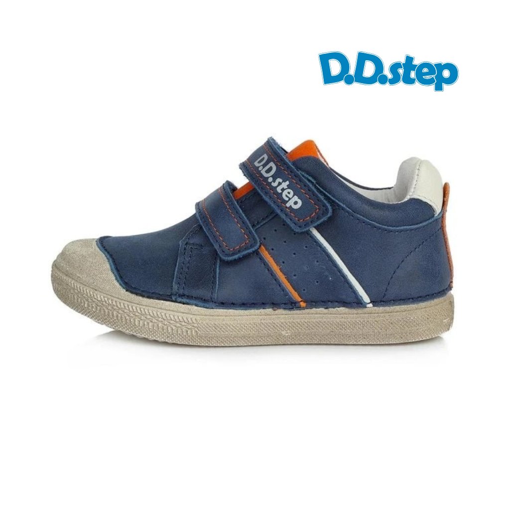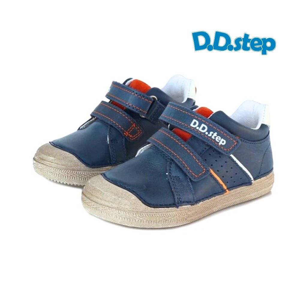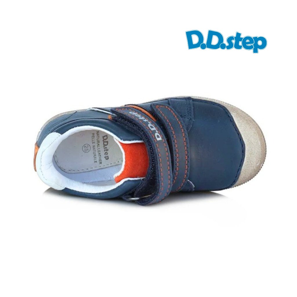 D.D. Step S049-52565 Navy sú chlapčenské kožené topánky v navy modrej farbe s oranžovými akcentmi a bielym pruhom na boku. Zvršok aj stielka sú z prírodnej kože – materiál, ktorý dýcha a príjemne obklopí nôžku. Mierne kotníkový strih poskytuje jemnú oporu členka.
