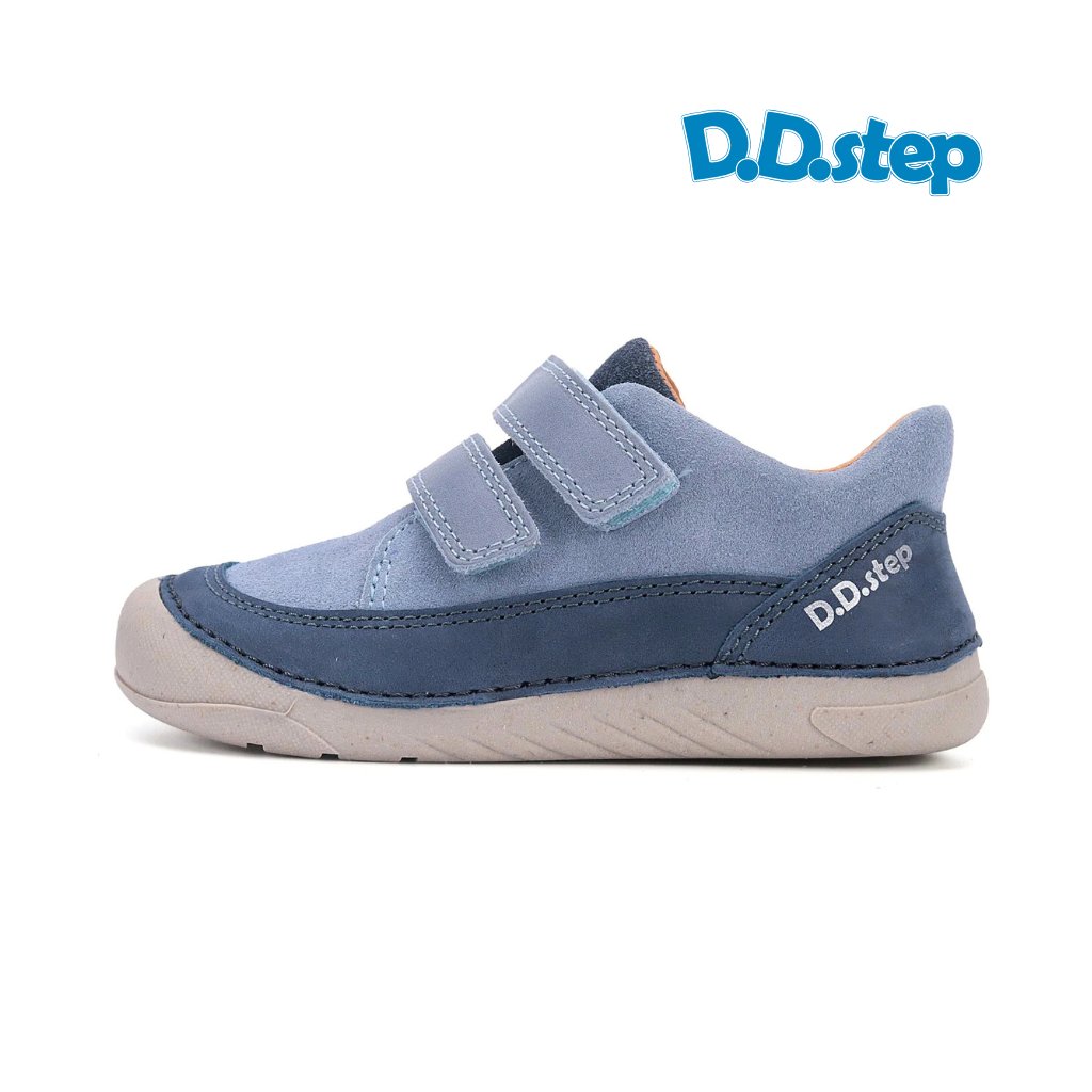 Model S108-61210A patrí do série S108 — najpremyslenejšej línie D.D.Step pre najmenšie deti. Zvršok je z kombinácie brúsenej semišovej kože v svetlomodrej farbe a hladkej prírodnej kože v tmavomodrej — oba materiály sú prírodné, priedušné a tvarujú sa podľa nôžky. Podšívka je takisto kožená.