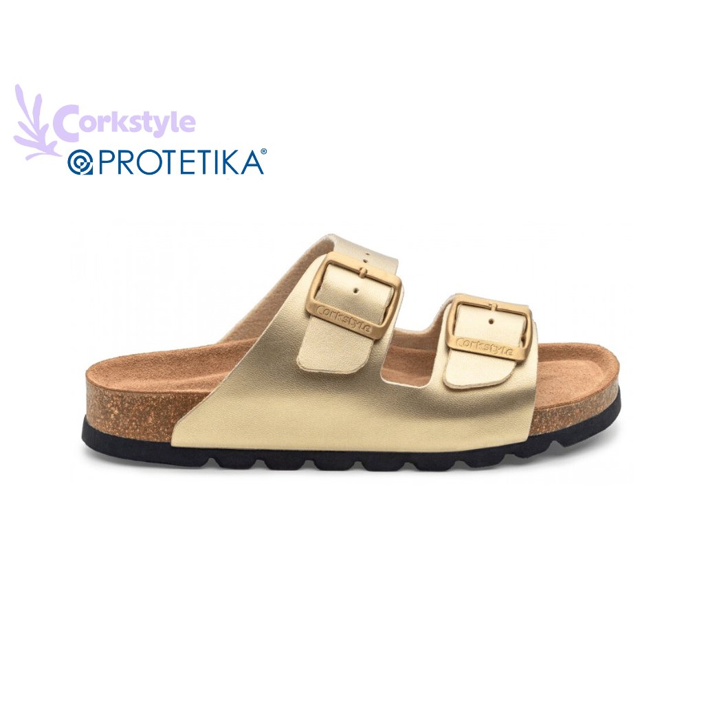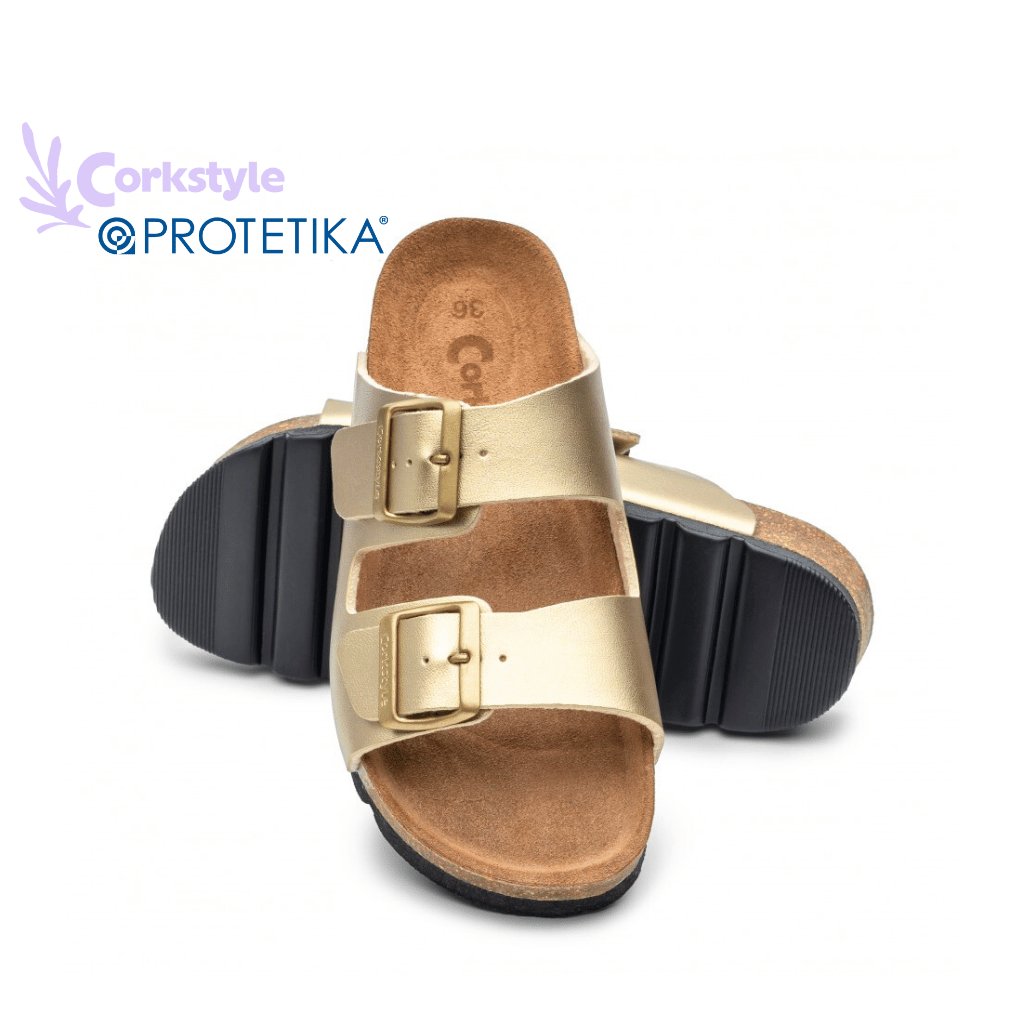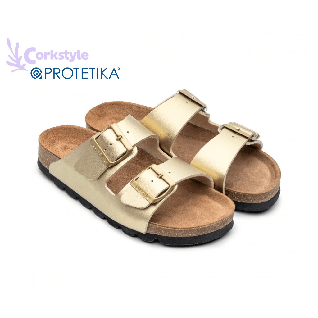 Aura Corkstyle je súčasťou prémiovej kolekcie CORKSTYLE, ktorá ponúka nadčasový dizajn a kvalitné materiály. Zlatý zvršok z ekokože dopĺňajú dve kovové pracky, vďaka ktorým si sandále jednoducho prispôsobíte podľa šírky vášho chodidla.