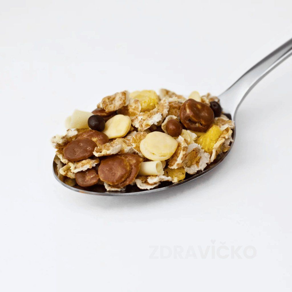 Chrumkavé müsli s mliečnou aj bielou čokoládou, čokoládovými hoblinami a lyofilizovaným pomarančom. Bestseller, ktorý nešetrí na čokoláde.