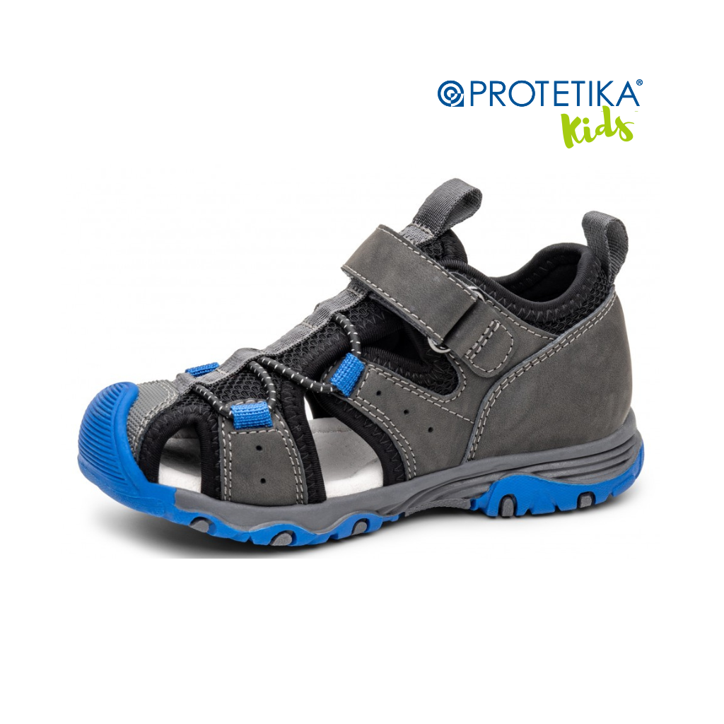 Protetika TED GREY sú chlapčenské letné sandále pre aktívnych chlapcov vo veľkostiach 27–32. Sivý zvršok z prírodnej prémiovej kože sa kombinuje s priedušnou textilnou sieťovinou – noha dýcha aj pri celodennom pohybe vonku. Uzavretá špička s tvrdenou ochranou v modrej farbe chráni prsty pri okopu a náraze. Dva remienky na suchý zips a elastické šnúrky na prednej časti spoľahlivo fixujú nohu v sandálkach.
