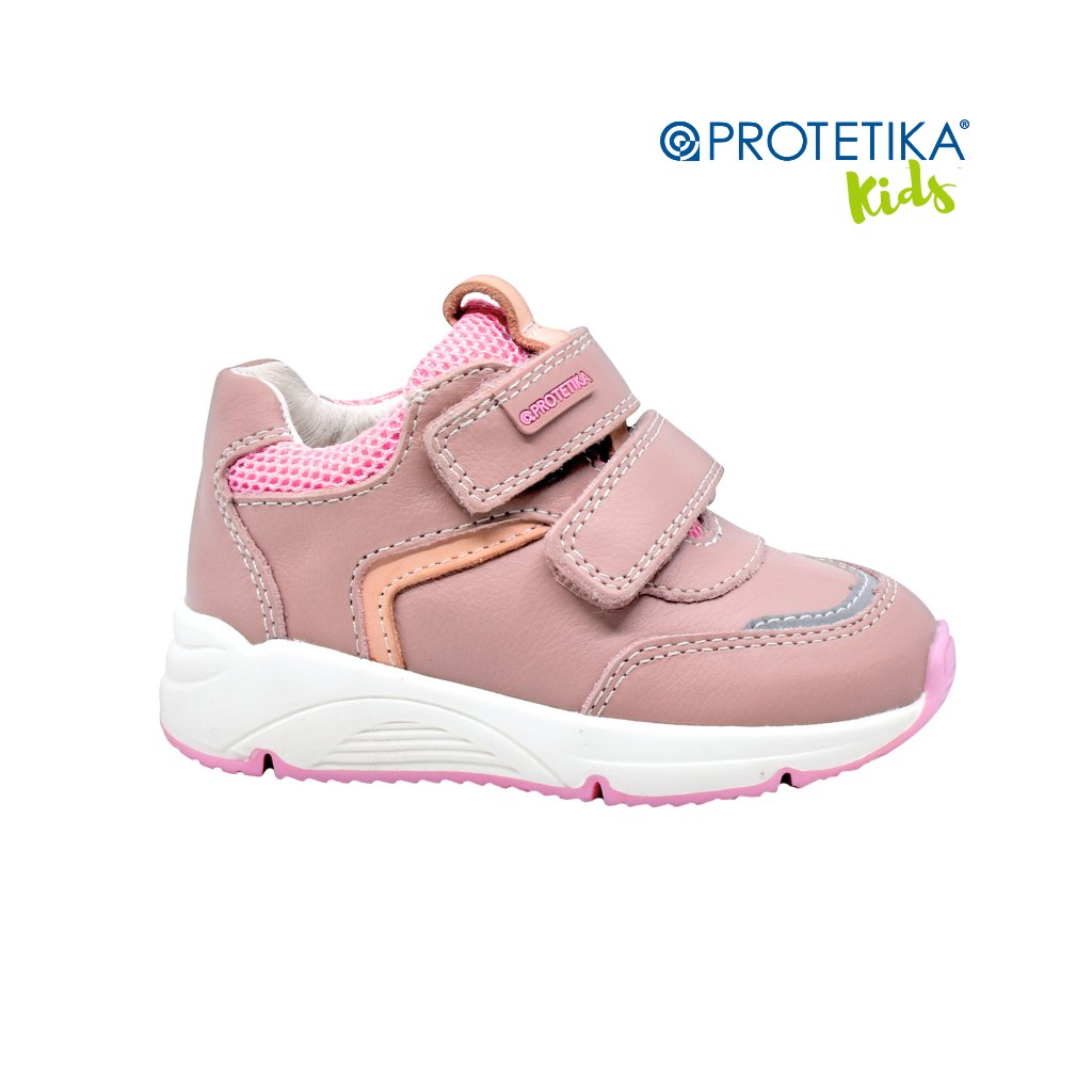 Protetika SALENA sú dievčenské tenisky určené pre najmenšie dievčatá na prvé samostatné kroky (veľ. 20–26). Zvršok z prírodnej hladkej kože v staroružovej farbe je doplnený ružovou sieťovinou na boku a jazyčku pre maximálnu priedušnosť. Biela podošva s ružovými akcentmi a pevná zadná časť topánky zabezpečia stabilitu pri každom kroku.